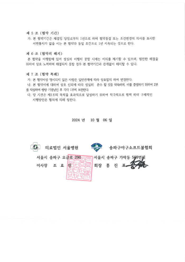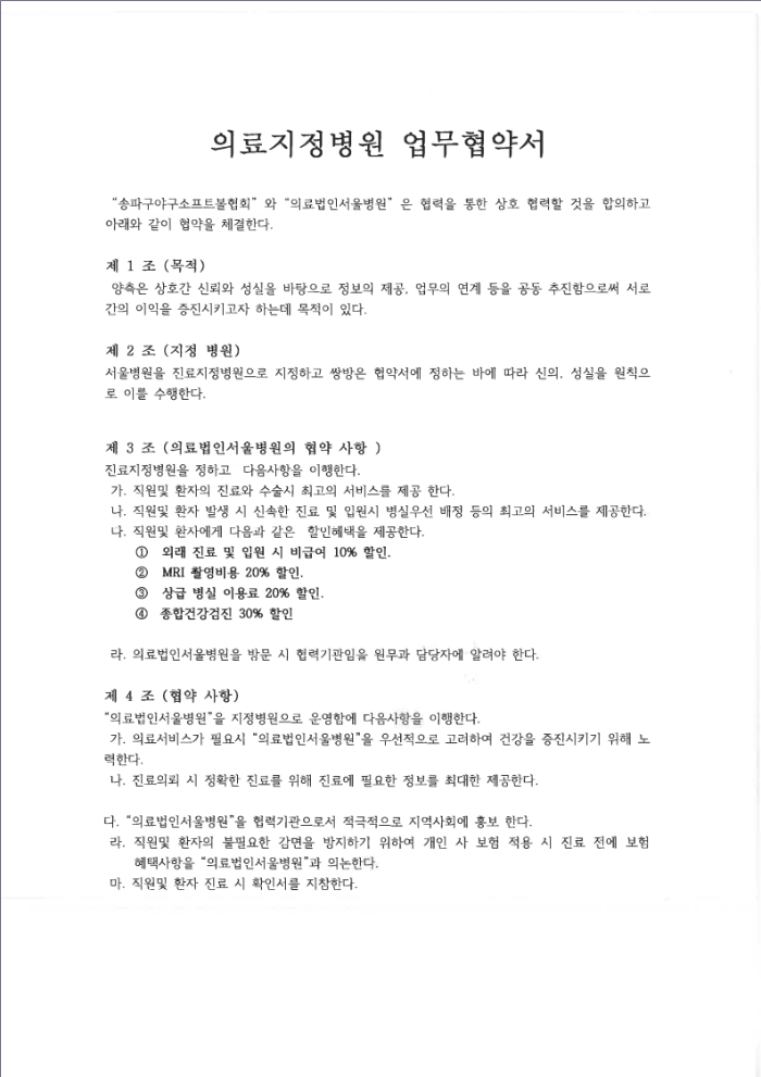 2024년 10월 06일 의료법인 서울병원과 송파구야구소프트볼협회간의 의료지정병원 업무협약이 있었습니다. 운동중 동호인분들의 부상에 신속히 대응하고 동호인 본인 및 가족들의 병원 이용시 할인혜택을 제공하게 되어 내용을 알려드리오니 많은 동호인분들의 이용을 부탁드립니다.