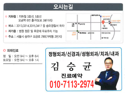 또한 병원 예약 및 할인 이용에 불편한 부분을 해소하기 위해 서울병원 김승균 본부장님(010-7113-2974)이 직접 동호인분들의 연락을 받아 처리함으로써 이용의 편의를 제공하고 있으니 병원이용이 필요할 시 주저하지 말고 "송파구야구소프트볼협회 동호인"이라고 말씀하시고 상담하시면 좋을것 같습니다. 동호인분들께 조금이나마 도움이 되셨으면 좋겠습니다. 감사합니다.